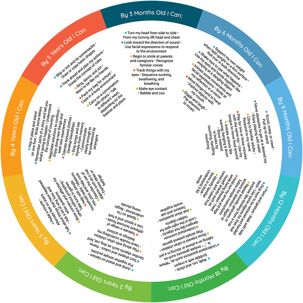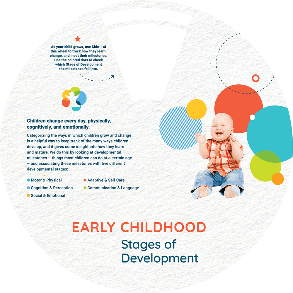 Milestones are things most children can do at a certain age. To help keep track of the ways children develop, milestones are related to different developmental stages. This wheel helps you check on your child’s milestones in each Stage of Development at different ages.